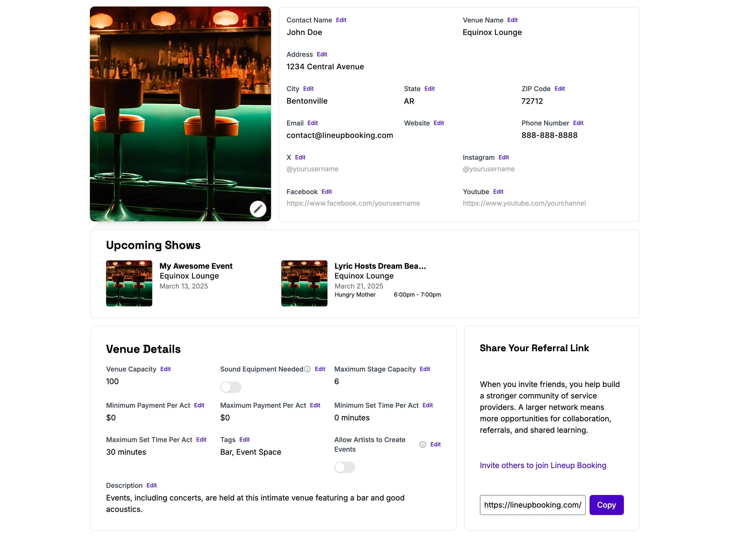 In the Venue Details section, you can provide key information about your venue, including Capacity, Maximum Set Time, and more. To allow artists to initiate bookings, enable the "Allow Artists to Create Events" option. Additionally, be sure to toggle on/off whether artists need to bring their own sound equipment in the corresponding field.