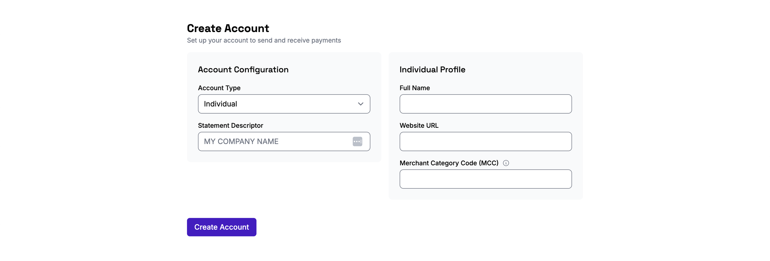 Choose your account type (Individual, Sole Proprietor, LLC, Multi-Member LLC, or Corporation).