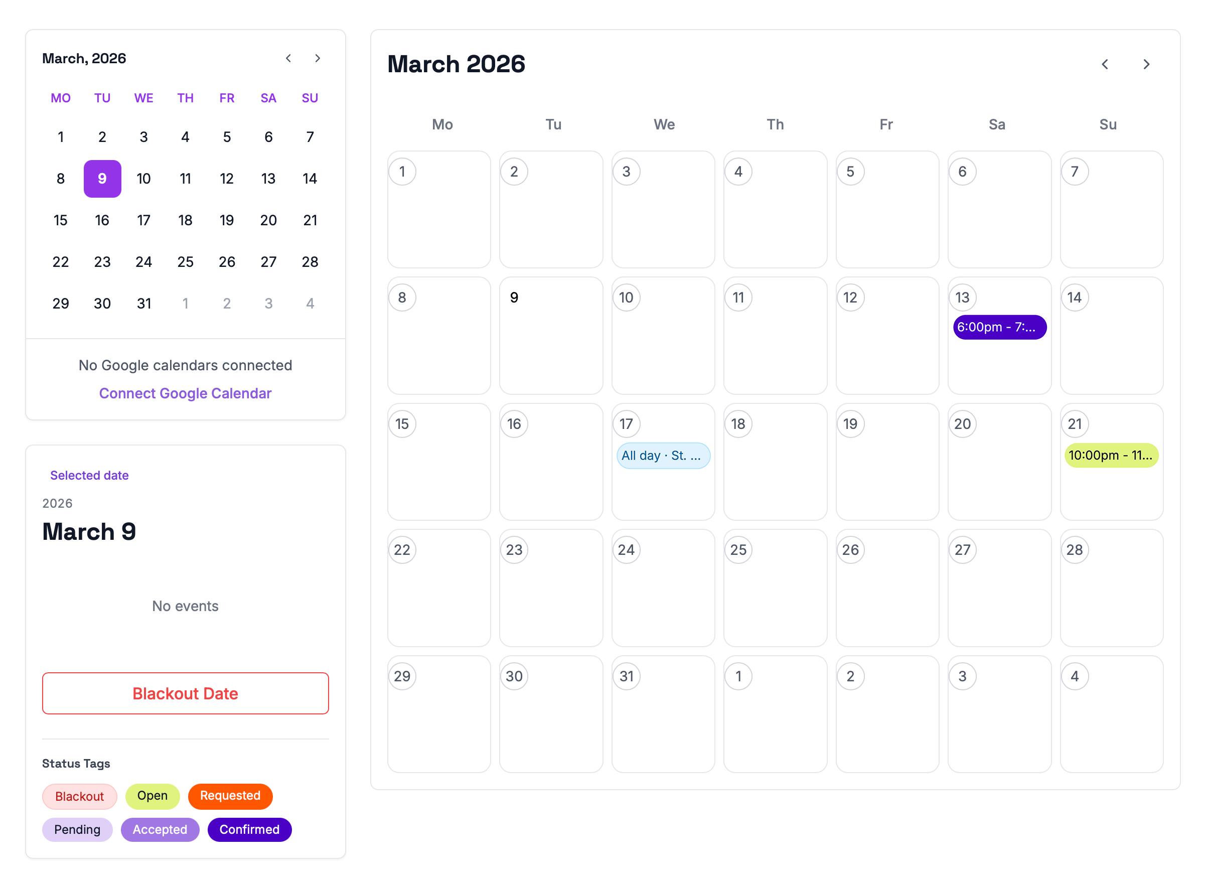 On the Calendar page, you can view all upcoming events at a glance. The built-in legend helps you quickly identify event statuses and understand how each time slot is scheduled.