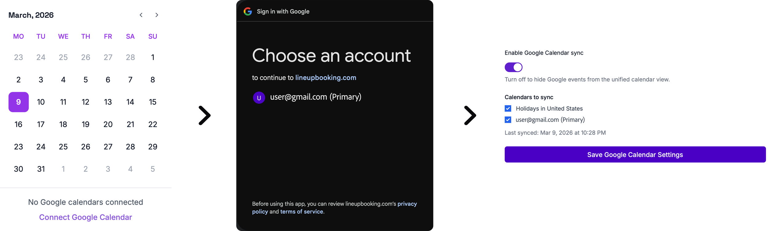 After selecting the calendars you want to display, click “Save Google Calendar Settings.” and your calendars will now be synced with Lineup.