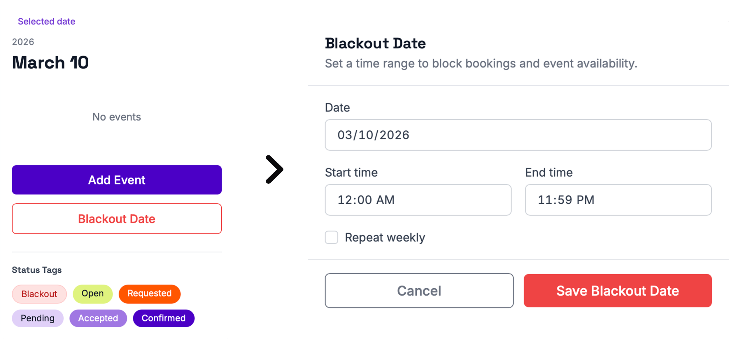 You can add blackout dates to your calendar by selecting the date you want to mark as unavailable. Then click “Blackout Date.”