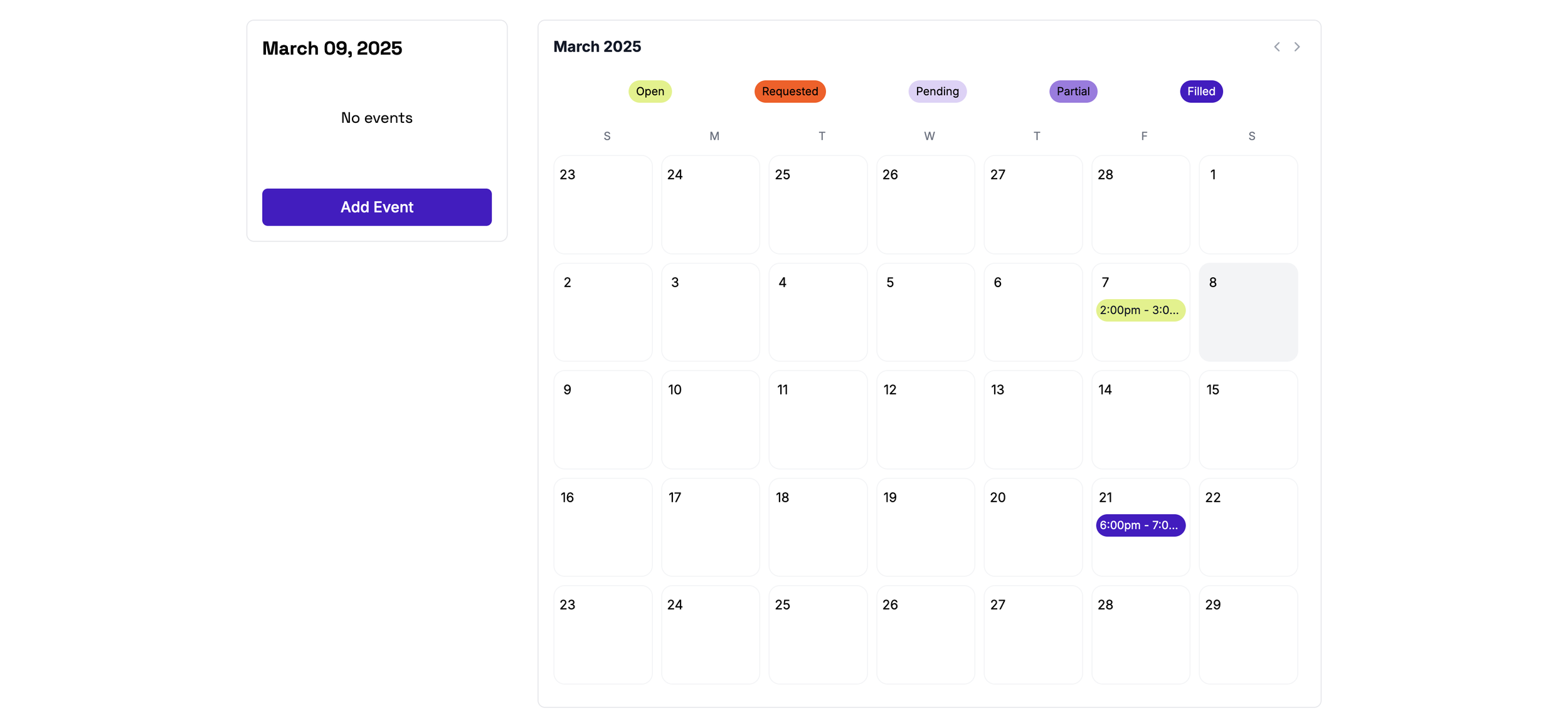 From the calendar page, users can see all upcoming events and their statuses via our intuitive legend UI, providing you with a top level view of each time slot in a scheduled event.